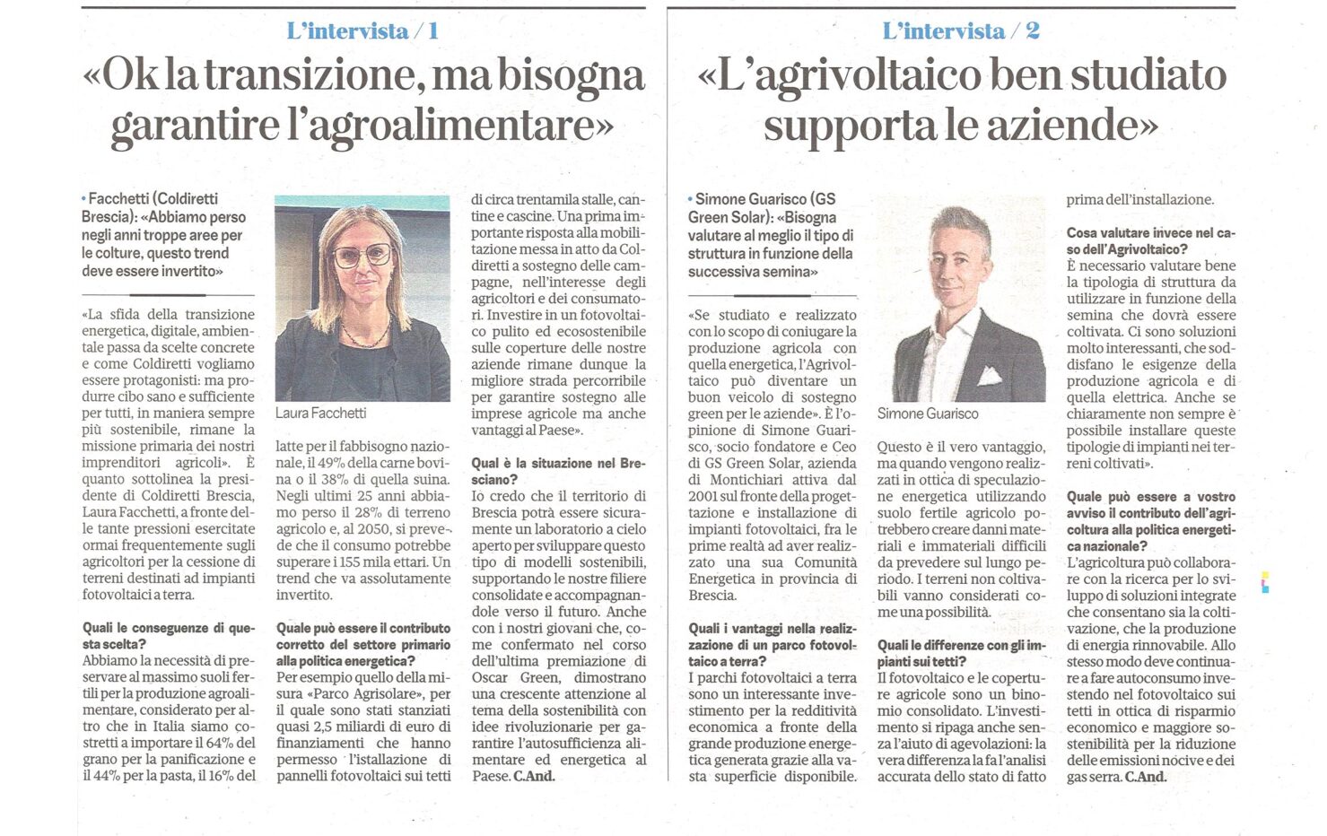 In questo articolo, pubblicato sul Bresciaoggi, nell’edizione del 29/02/24, il nostro CEO Simone Guarisco risponde ad alcune domande in merito al binomio tra la produzione agricola e gli impianti agrivoltaici, oltre ad offrire spunti di riflessione sul ruolo che l’agricoltura sta assumendo nel mercato della produzione di energia rinnovabile.